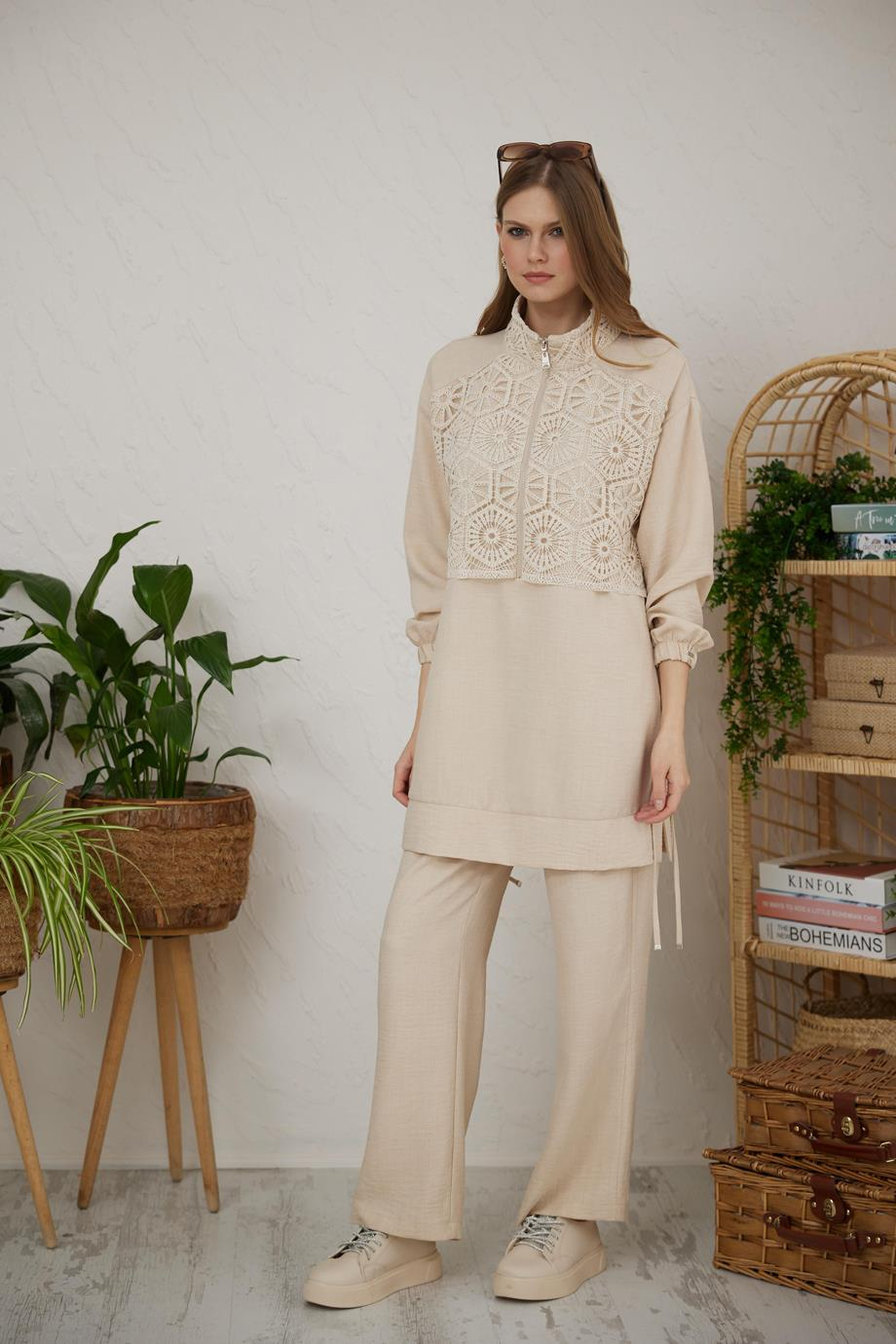 DANTEL DETAYLI KETEN BEJ KADIN TAKIM TAKIM MB24.596-2Y4 (P-0000000028614)