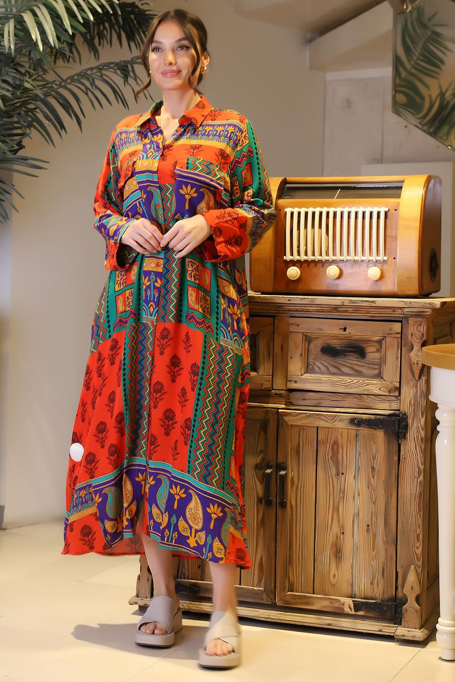 GÖMLEK YAKA DESENLİ MOR KADIN ELBİSE 001-2Y4 (P-0000000031844)
