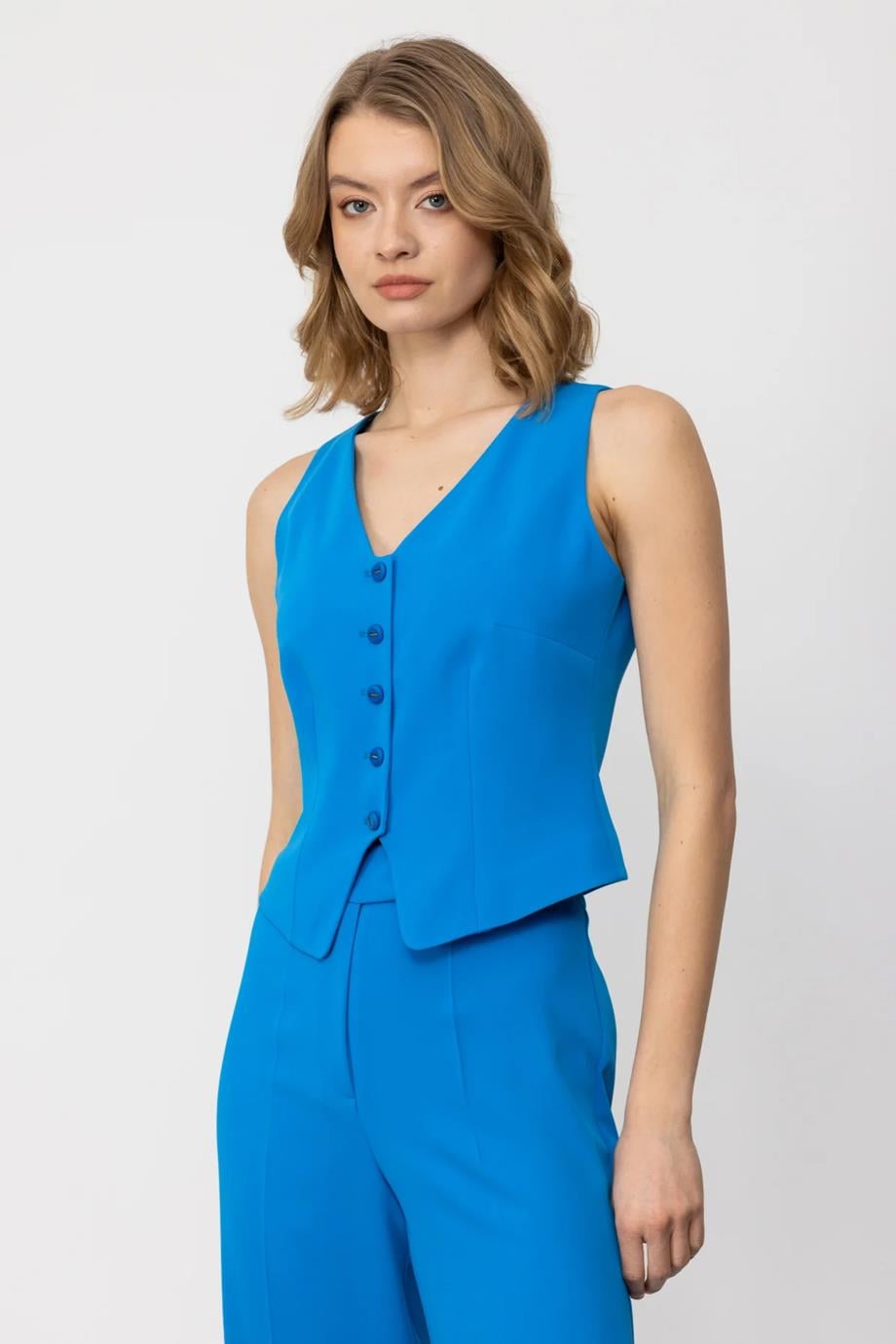 V Yaka Düğmeli Mavi Kadın Yelek 5038-2Y4 (P-0000000029295)